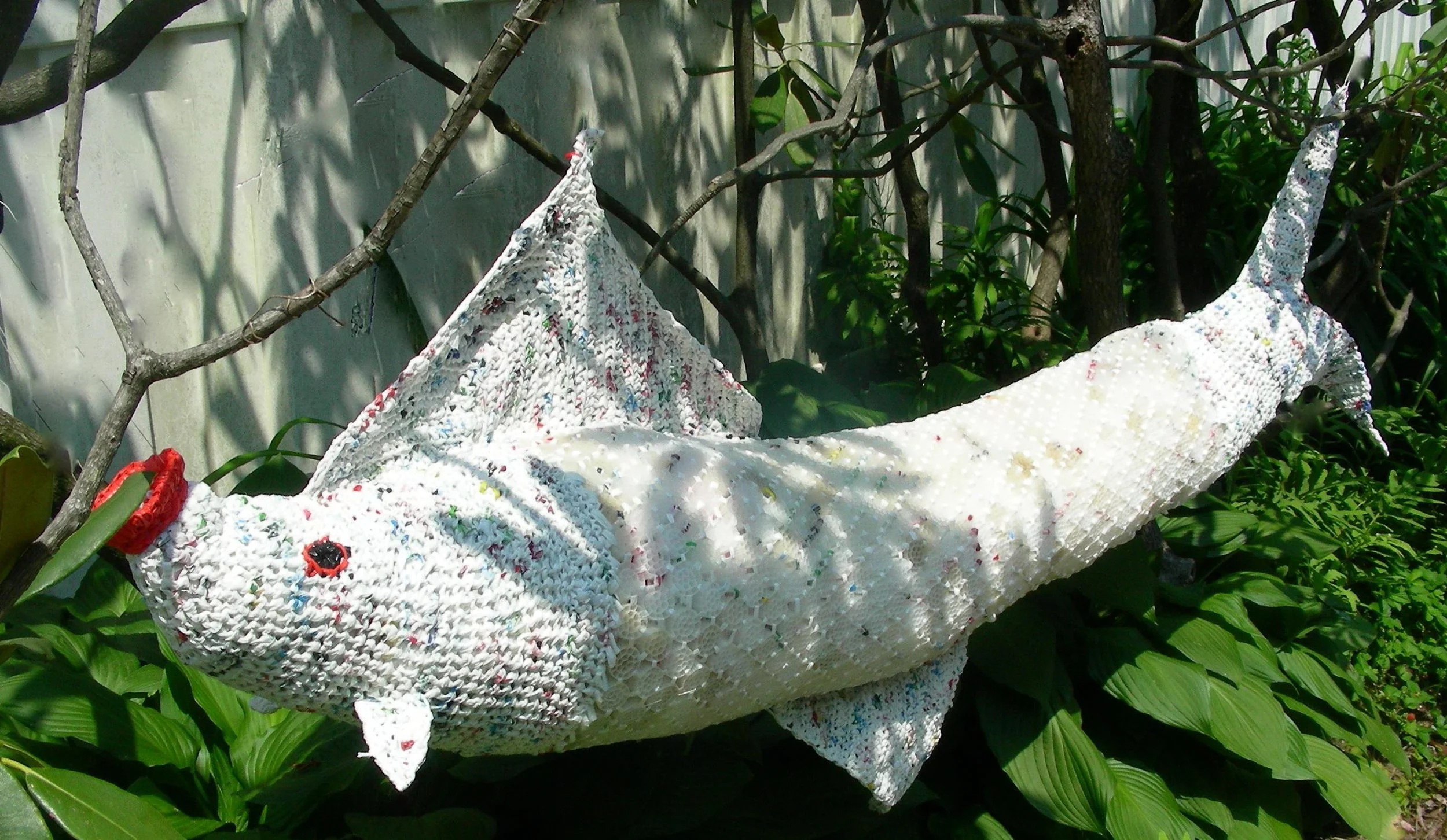 Fish sculpture made from plastic aeration disks created by Barbara Karyo